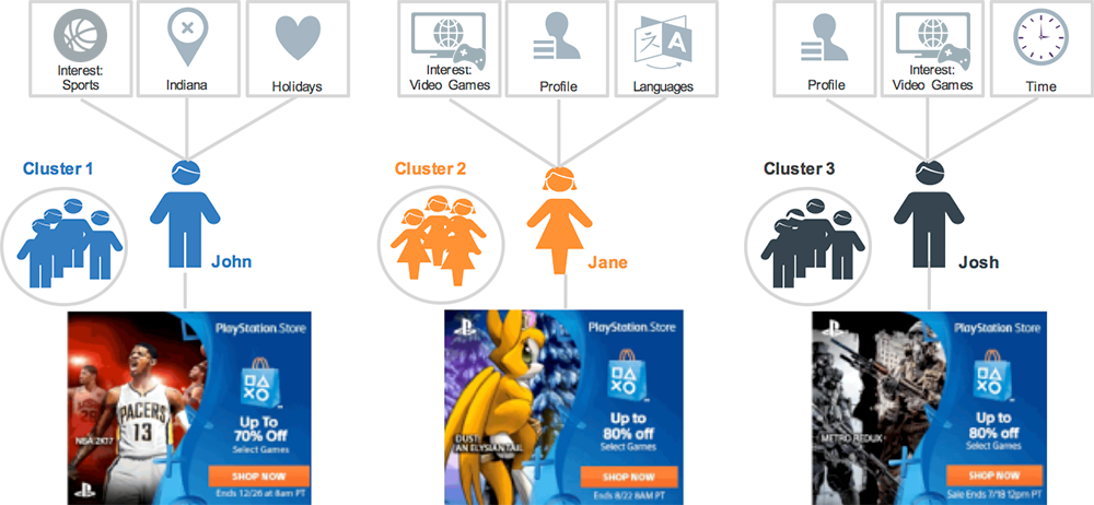 - Example: A male consumer that is a sports enthusiast from Indiana and viewed products on the Sony PlayStation site is put into a cluster, a microsegmentation of shoppers.